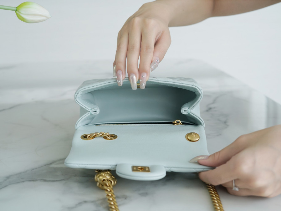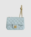 • 샤넬 클래식 플랩백 뉴미니 라이트블루 금장 까멜리아