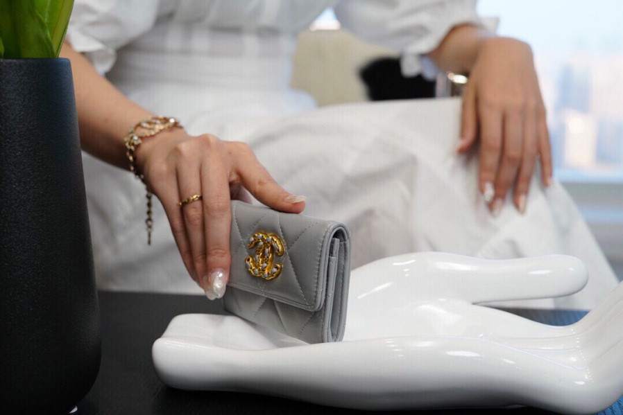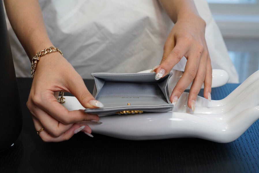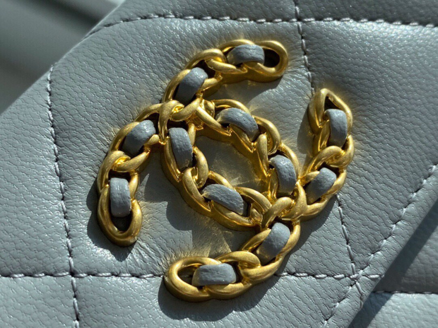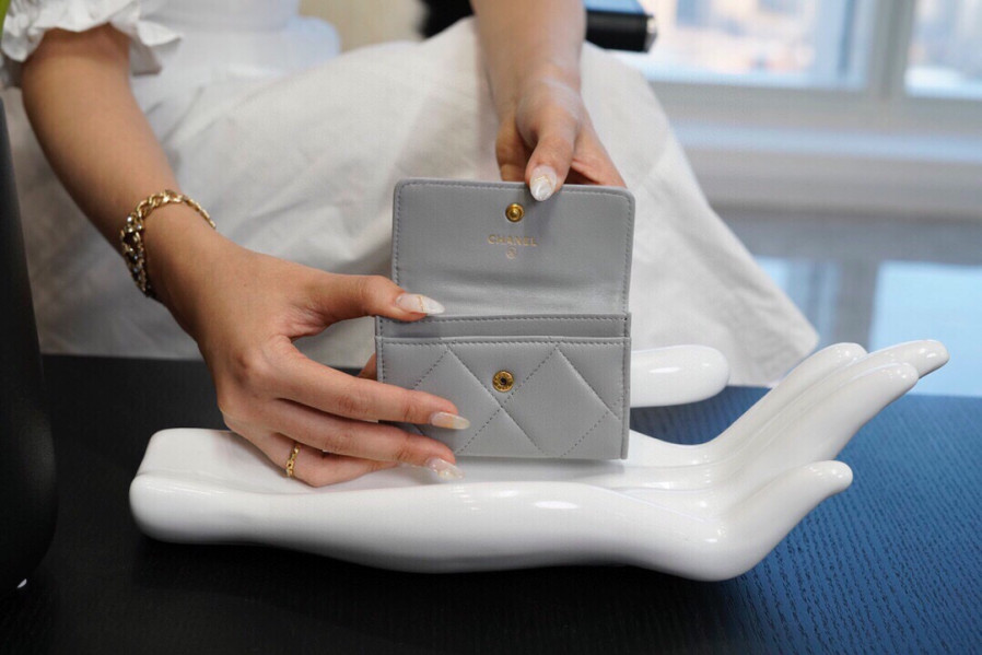 • 샤넬 19 플랩 카드지갑 램스킨 금장 소라 AP1790