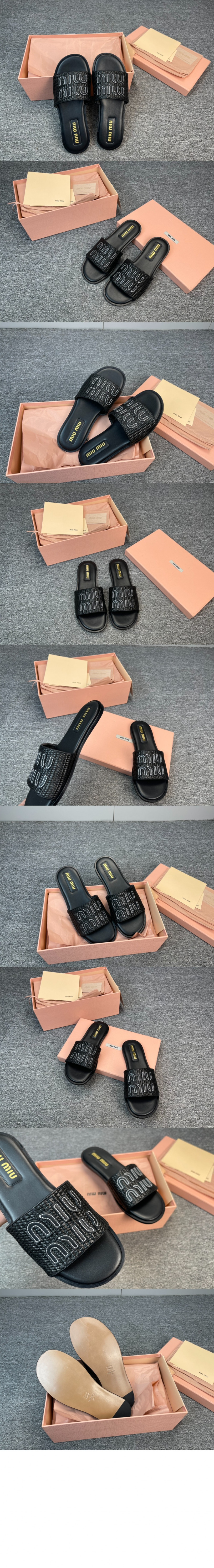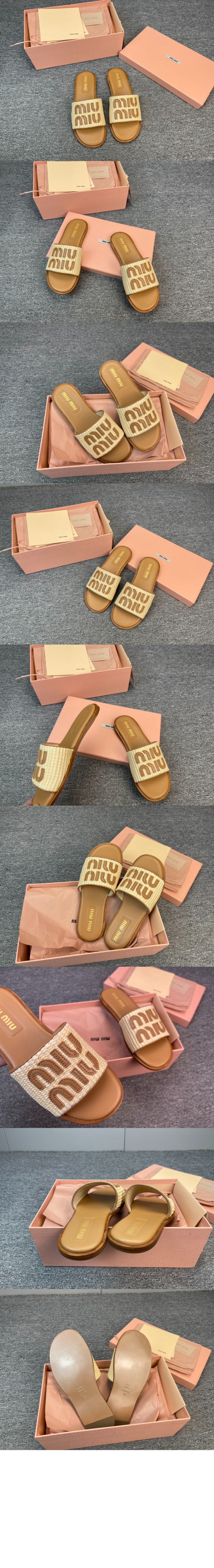 미우미우 라피아 효과 우븐 패브릭 슬라이드 5XX644 요약정보 및 구매