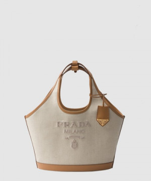 프라다 미디엄 리넨 혼방 및 가죽 토트백 1BG471 > WOMAN