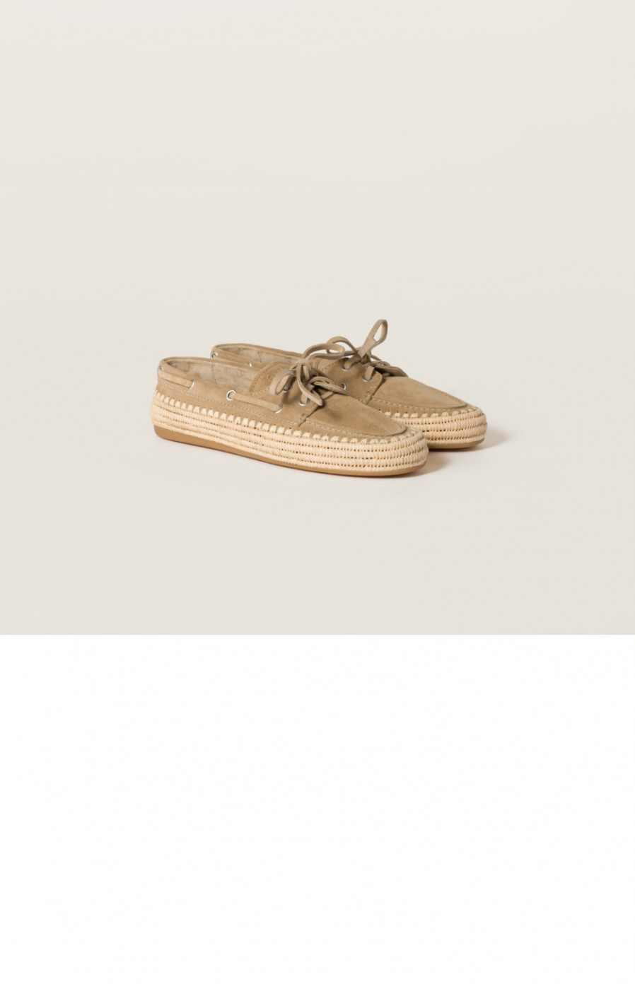미우미우 스웨이드 및 라피아 보트 슈즈 5D378E > WOMAN