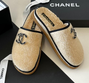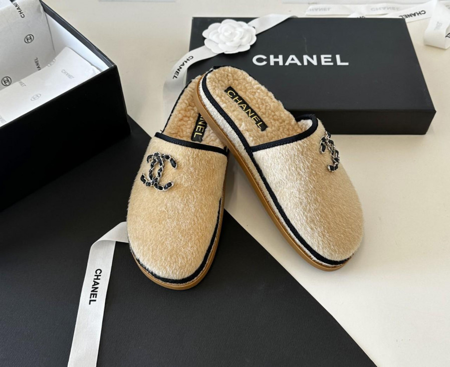 샤넬 체인 CC 로고 시어링 스웨이드 뮬 슬리퍼 > WOMAN