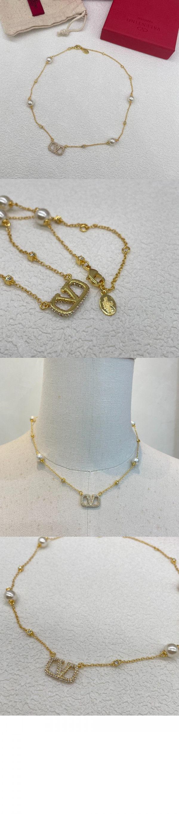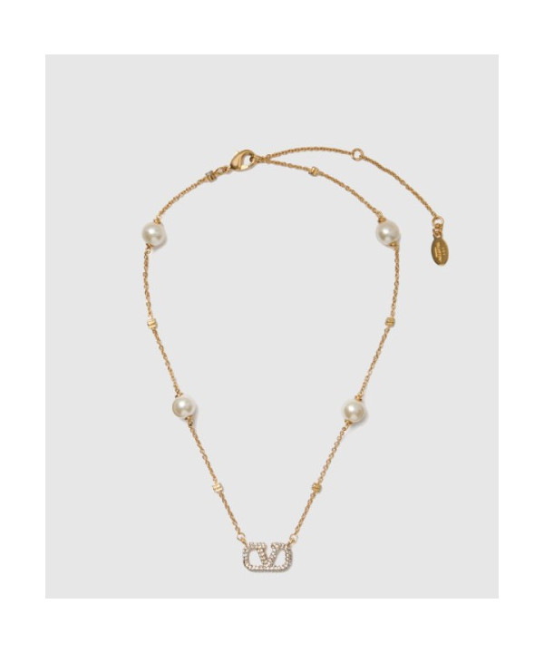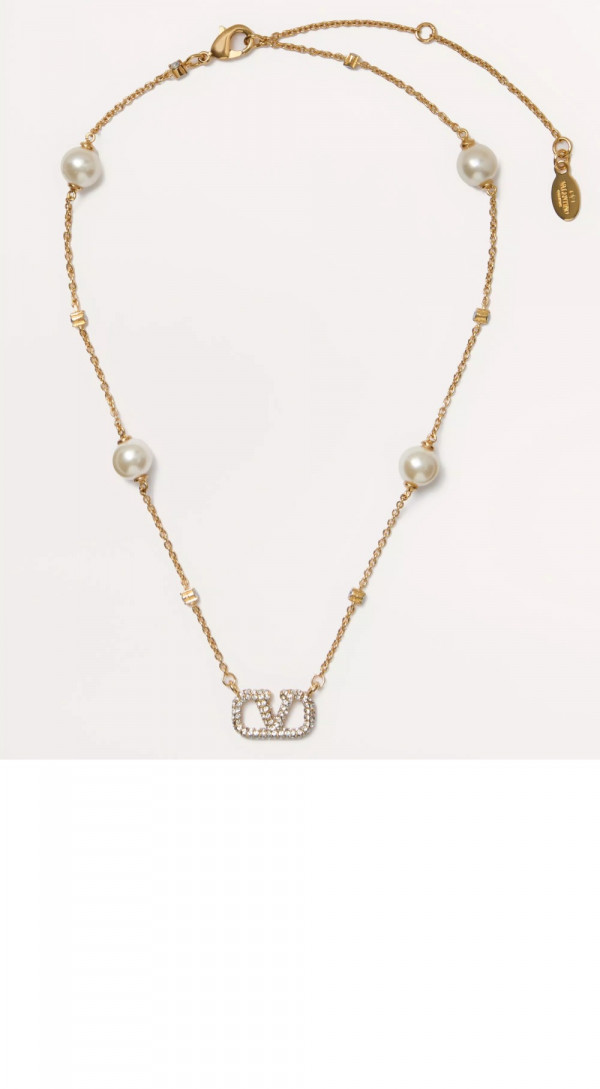 발렌티노 크리스털 및 진주 장식 브이로고 시그니처 메탈 네크리스